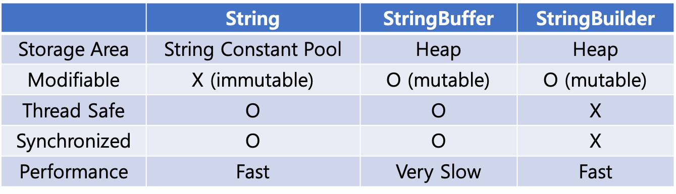 - String은 한 번 생성되면 할당된 메모리 공간이 변하지 않는다.
